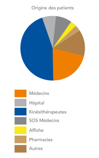 Les enfants pris en charge sont majoritairement envoyés par nos confrères (45 %), les médecins (21 %), SOS Médecins (8 %), l’hôpital (7 %), notre affiche (3 %), les pharmacies (3 %) et autres (13 %).